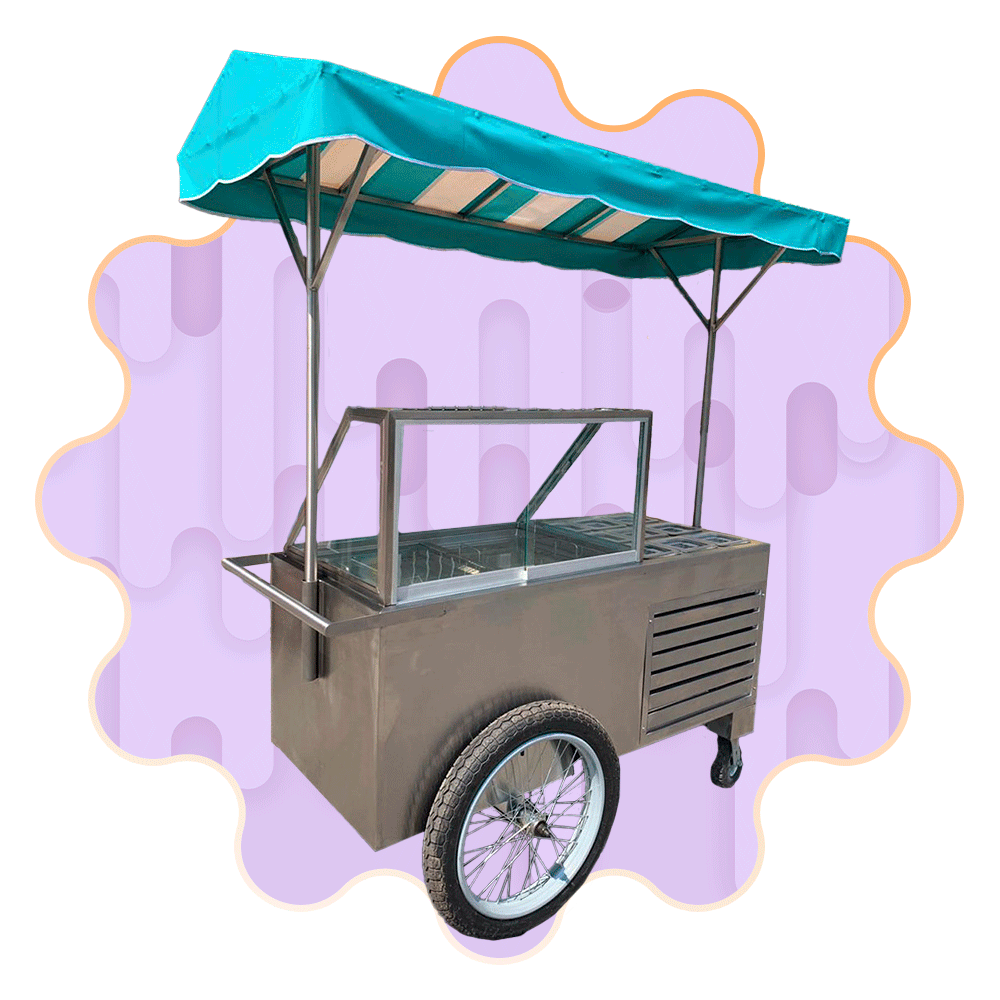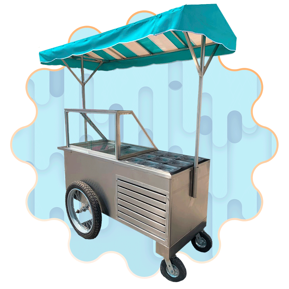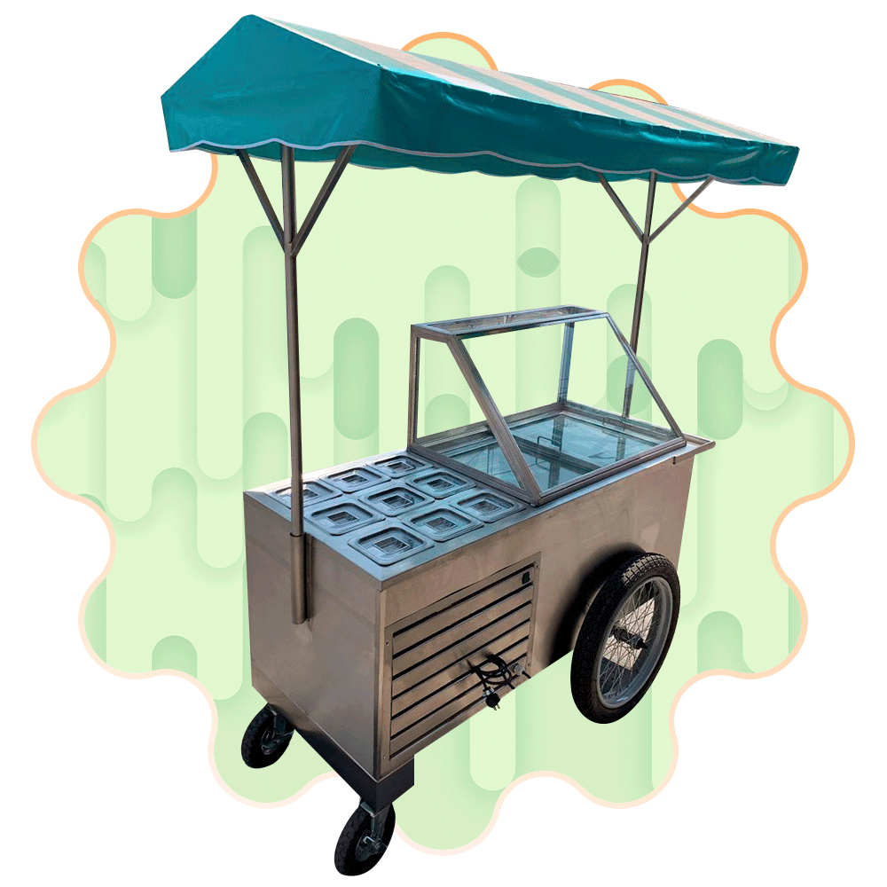 Este carro se adapta para la venta de: nieve de garrafa, helado, aguas frescas, frappe, paletas, smoothies, bolis, tostitos, guasanas, papas, etc.